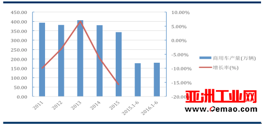 2011 年至 2016 年 1-6 月商用車產量及增長率情況如下: