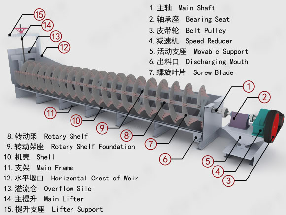 螺旋分級(jí)機(jī)具體界定為溢流堰位置高于螺旋軸下端的軸承中心,但低于溢流端螺旋的上緣的為高堰式螺旋分級(jí)機(jī),它具有一定的沉降區(qū)域,適用于粗粒分級(jí),可以獲得大于0.83至0.15毫米的溢流粒度;溢流堰低于溢流端軸承中心的為低堰式螺旋分級(jí)機(jī),它沉降區(qū)面積小,溢流生產(chǎn)能力低,通常不用于分級(jí)作業(yè),而用來沖洗礦砂進(jìn)行脫泥;溢流端的整個(gè)螺旋都浸沒在沉降區(qū)的液面下的為沉沒式螺旋分級(jí)機(jī),其沉降區(qū)具有較大的面積和深度,適用于細(xì)粒分級(jí),可以獲得小于0.15至0.07mm的溢流粒度。